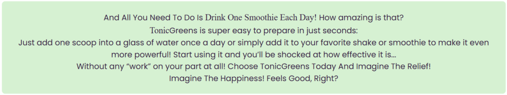 Naturally, each individual will be slightly different, but we’re all human beings and we all function the same way. TonicGreens has already worked for almost thousands of people, so there’s no reason why it won’t work for you too. And remember, if you’re still a little unsure you can try it risk-free because your order comes with a 60-day money back guarantee, so you have absolutely nothing to lose.